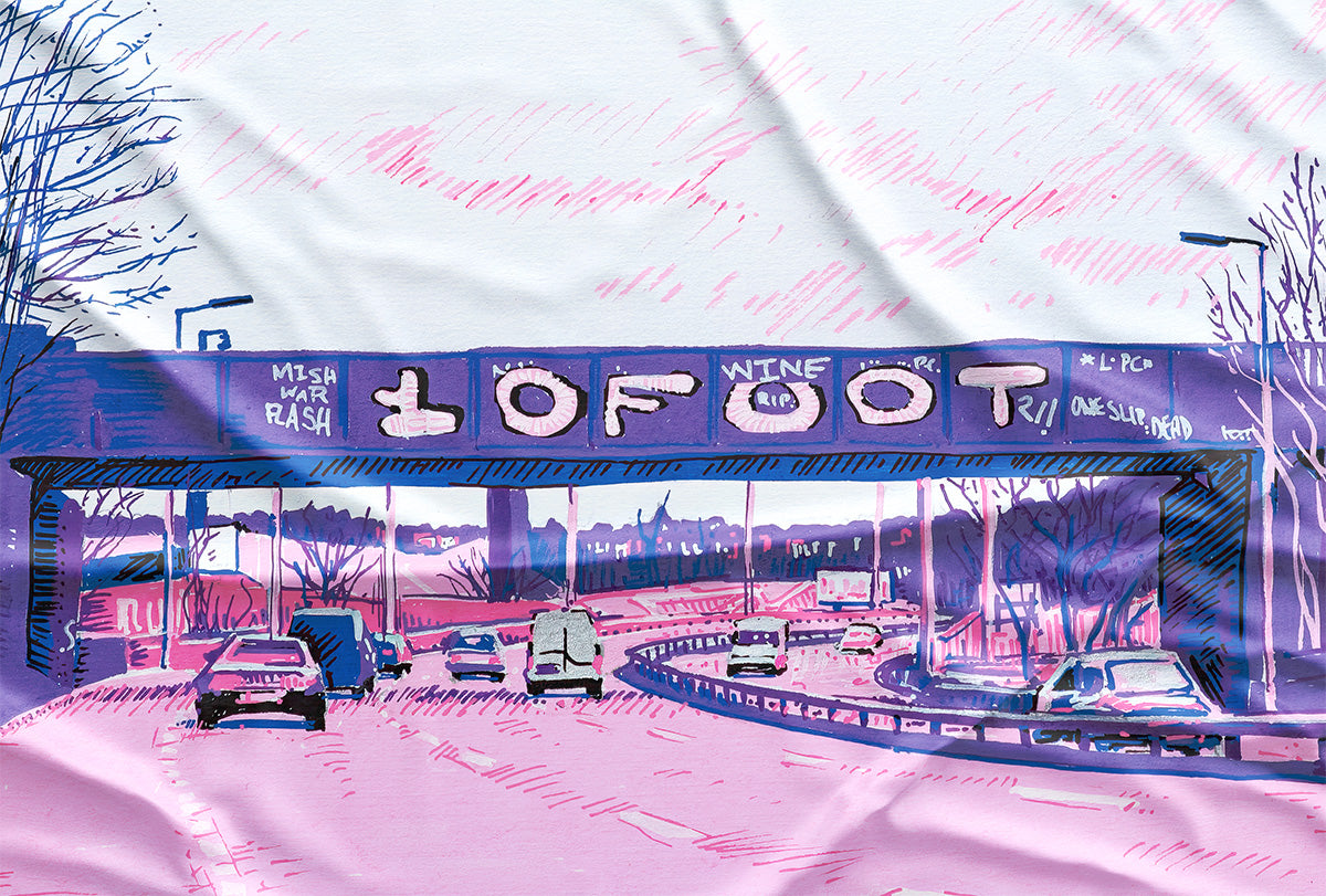 The print on this T-shirt is taken from a piece of original artwork drawn with Posca pens. The subject of the print is the rail bridge over the A2 near Westcombe Park in SE London, and features the work of graffiti writer 10FOOT. This is what's known as a heaven spot - one slip and you're dead. The scale of this piece is epic and serves as a cheery farewell from King 10FOOT to drivers leaving London on their way out to Kent.
